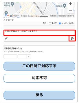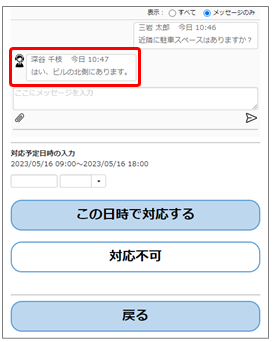 対応可否の回答をする前にメッセージを送信することができます。必要な場合は画像やファイルも添付できます。これについては「4.1 メッセージをやり取りする」と「4.2 画像などのファイルを送受信する」を参照してください。