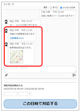 手配担当者と画像やファイルをやり取りすることができます。