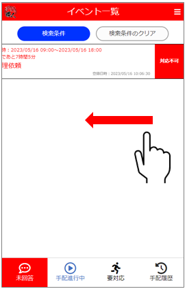 [未回答]一覧内の該当イベントを左にスワイプして、[対応不可]をタップします。