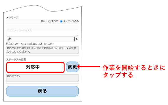 3.作業を開始するときに[対応中]の右の[変更]ボタンをタップします。