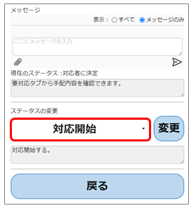 ここに表示されるステータス名は次に遷移するステータスです。標準では、[対応中]の次は[対応完了]ステータスが表示されます。